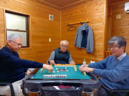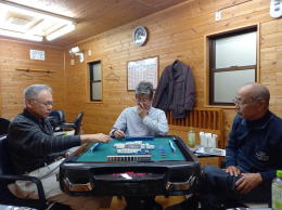 隣の卓では同年輩のメンバーが3人麻雀に興じる中