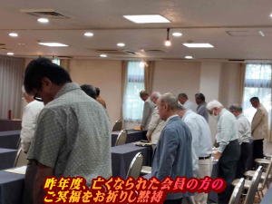 総会の始めは司会の音頭で昨年度ご逝去された物故者4名のご冥福をお祈りし、黙祷を捧げた後、日浦幹事の