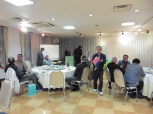 途中、ゴルフ、グラウンドゴルフ、釣りの各世話人から同好会の活動内容の説明や参加者募集を行った後、恒例